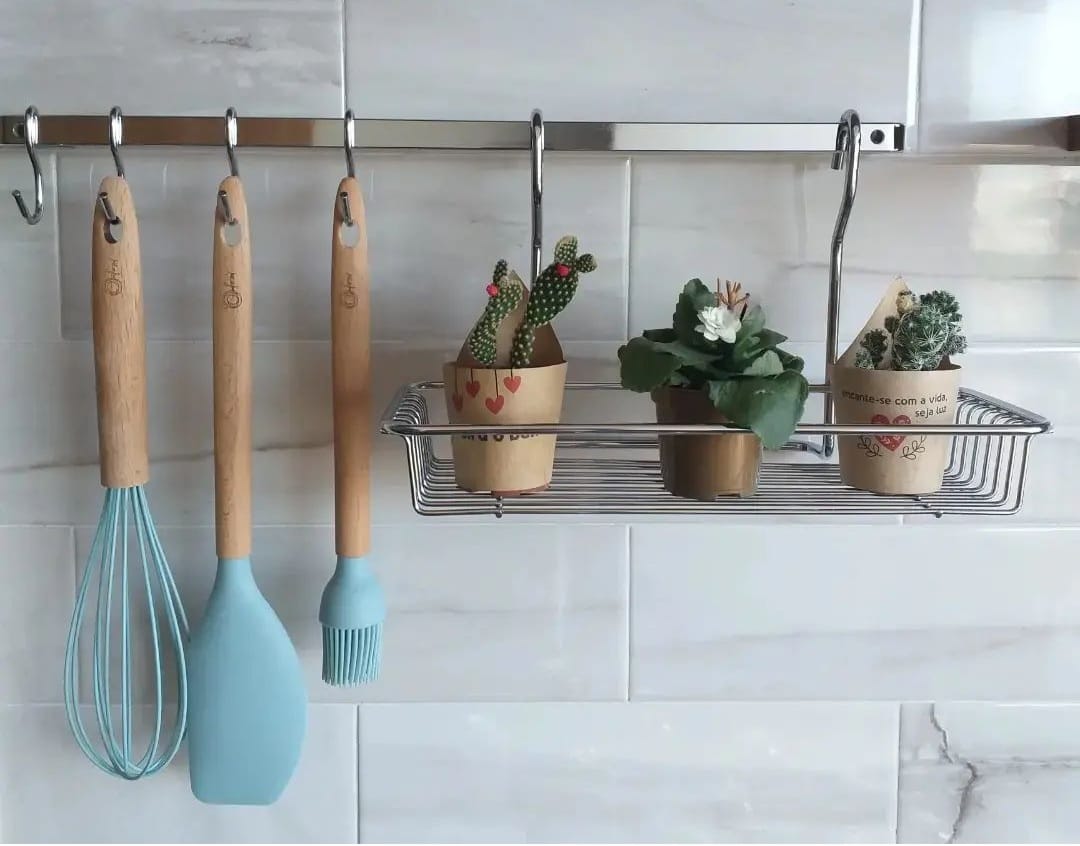A Barra da linha de suportes aéreos otimiza os espaços da cozinha, pois com os utensílios fixados na parede, a bancada e a pia ficam livre para a preparação dos alimentos.