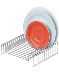 Com o Organizador você pode guardar 12 pratos de tamanhos diferentes sem precisar empilhá-los, diminuindo o risco de quebras. Também ocupa menos espaço do armário e deixa o acesso à louça muito mais fácil. Também pode ser utilizado como escorredor de pratos sobre a pia da cozinha.